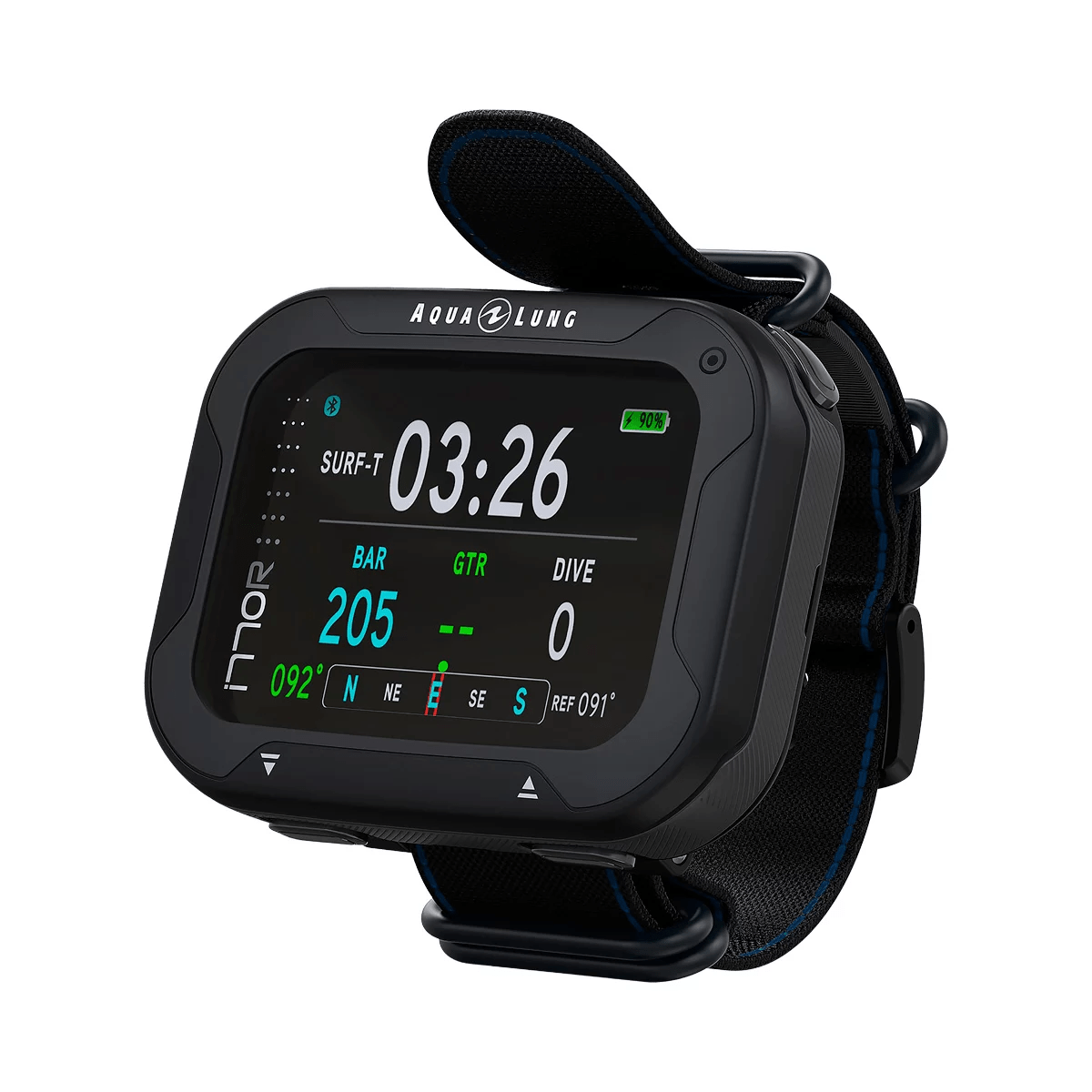 - 3-akset fuldt tilt kompas. Letlæseligt kompasgrafik med en kompasbærende lås og gensidig kurs for nem navigation. En alternativ kompasbjælke kan vises på den primære dykskærm med et tryk på en knap.